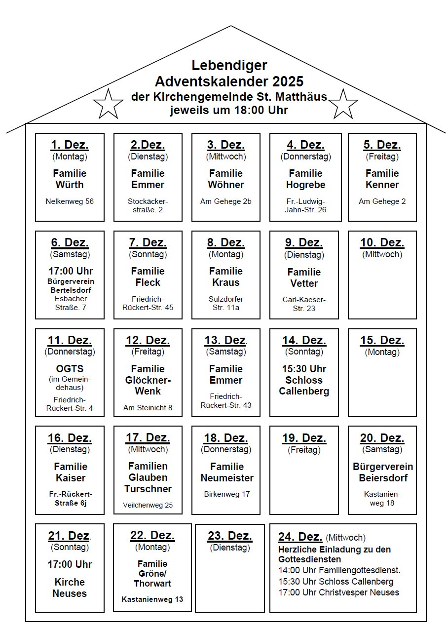 Wir wollen den Advent gemeinsam feiern und jeden Abend soll mit Musik, Geschichten und Beisammensein ein Fenster in unserer Gemeinde zum Leuchten gebracht werden. Herzliche Einladung zu den adventlichen Runden bei unseren Gastgeber*innen in Neuses, Beiersdorf, Bertelsdorf und Glend.